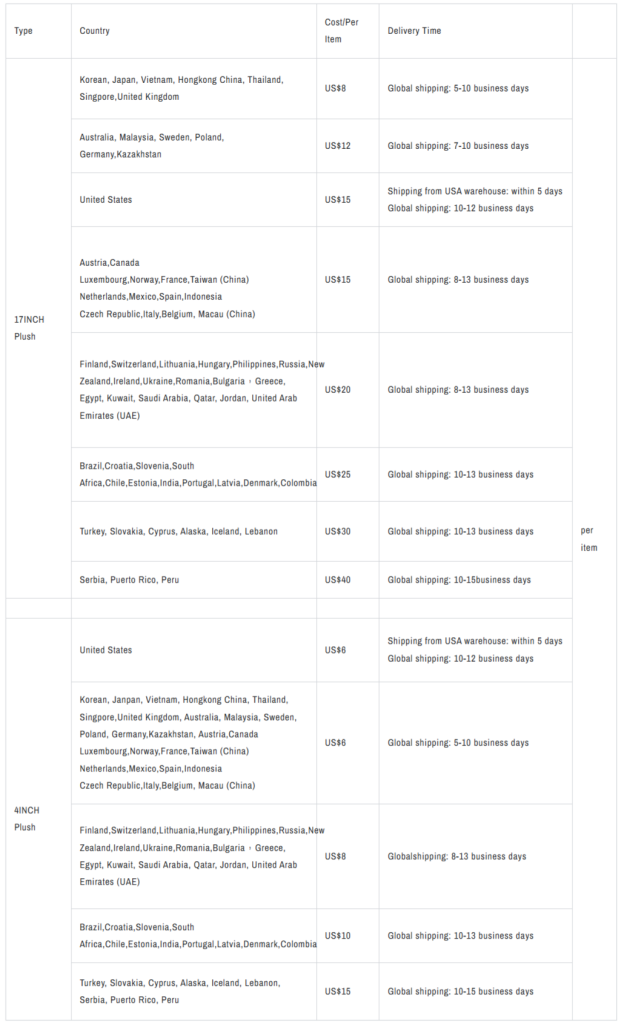 For pre-order items, kindly refer to the “product description” section to ascertain the pre-order timeline. Should your order exceed the specified duration without being shipped, please reach out to service@plushshop.com.